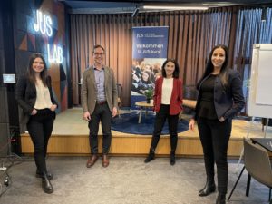 JUS – Juristenes utdanningssenter har gjennomført årets første webinar: Miljøkrav og sertifiseringsordninger i entreprisekontrakter. Avbildet er Vjosa Maxhuni, Knud Jacob Knudsen, Fatima Dahri og Josefine Magnussen.